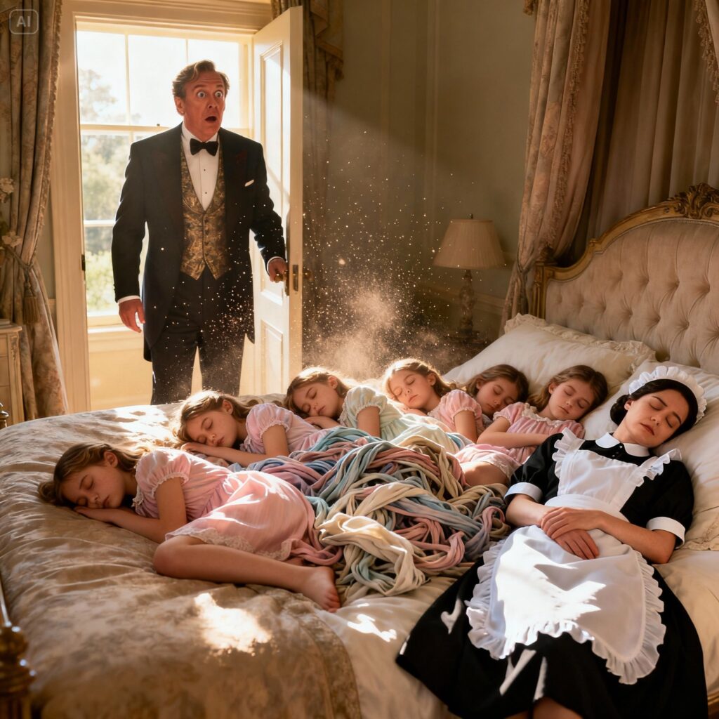 Six girls stood watching from the stairs. Hazel, twelve, her posture rigid. Brooke, ten, pulling at her sleeves. Ivy, nine, eyes darting. June, eight, pale and quiet. The twins Cora and Mae, six, smiling with too much intention. And Lena, three, clutching a torn stuffed rabbit.