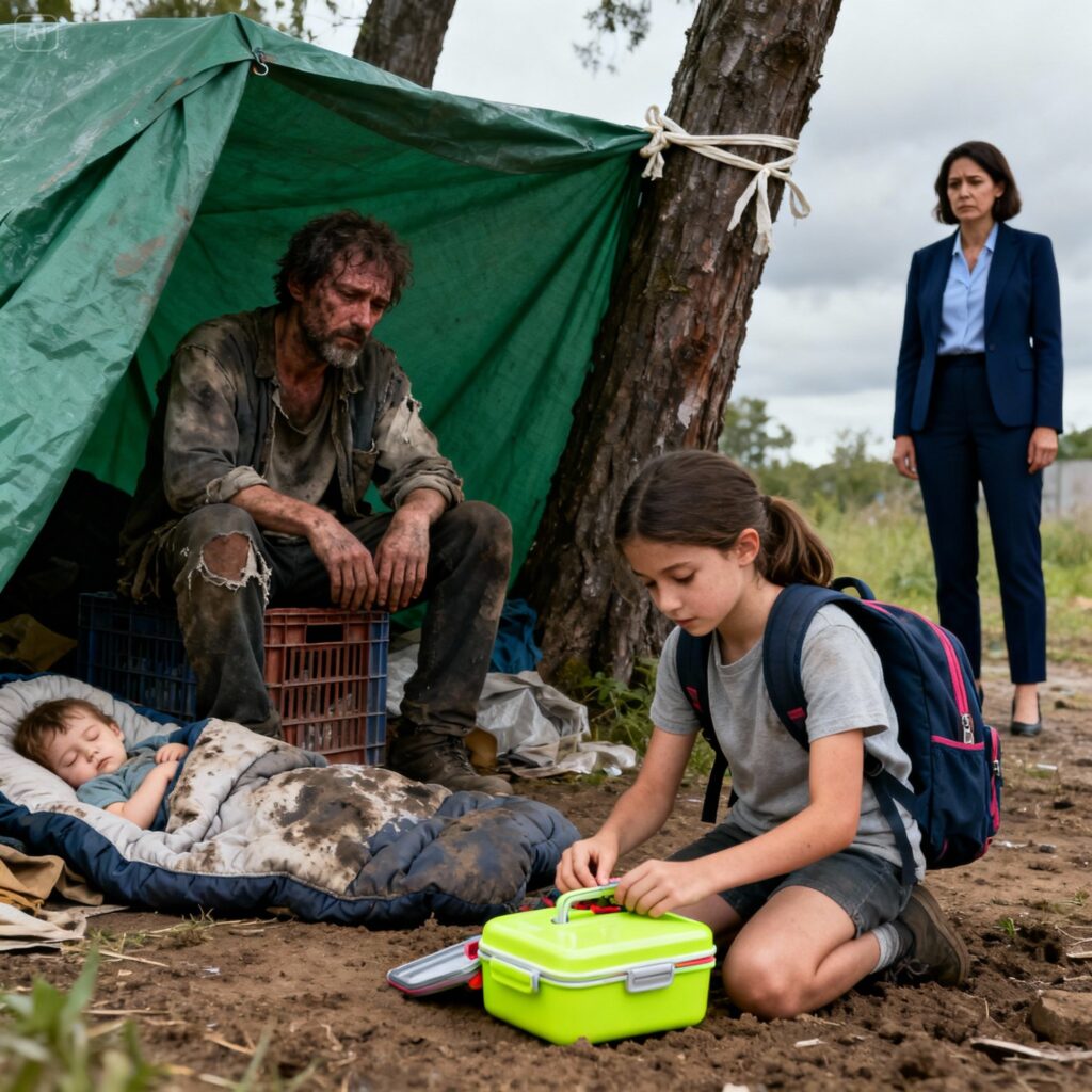 When she reached a clearing, I saw a makeshift shelter built from a battered camping tent, several tarps, and what looked like discarded plywood. A man sat beside the shelter with his head buried in his hands. On a blanket nearby lay a small boy, flushed and restless in sleep.