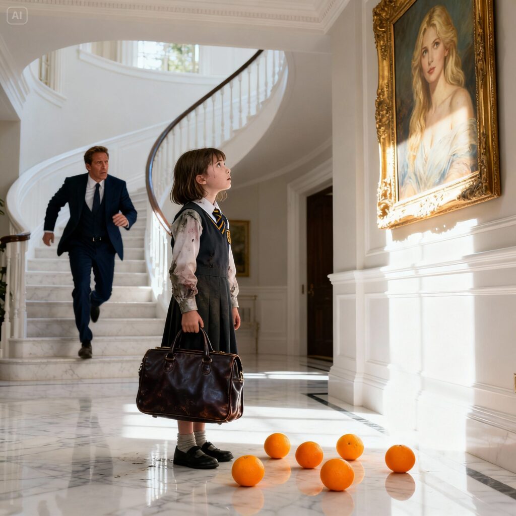 A girl. Twelve, maybe. Thin, with dark hair pulled into a crooked ponytail and a faded public-school polo that didn’t quite fit. She clutched a plastic grocery bag so full it pulled her body to one side. Inside, I could see the bright round shapes. Oranges.