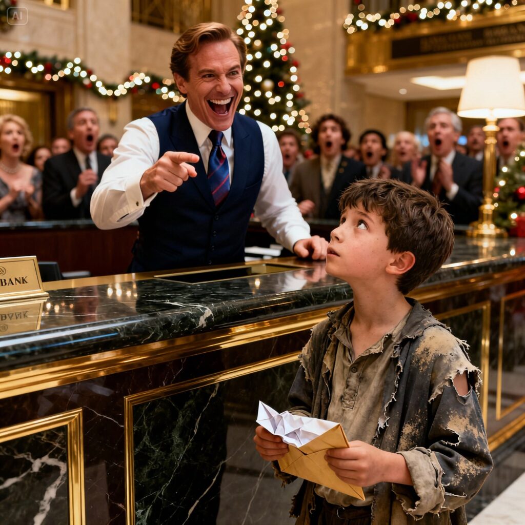 The bank manager, Tristan Vale, stopped mid-gesture, scrutinizing the boy like a rare insect trapped under glass. Then laughter erupted, a low, cruel sound that bounced off the marble walls. “Check your account?” he said, tone dripping with mockery. “This isn’t some charity. Who even let you in here?”
