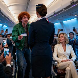 “Sir,” she replied, her smile tightening, “economy seating is toward the rear of the aircraft.”