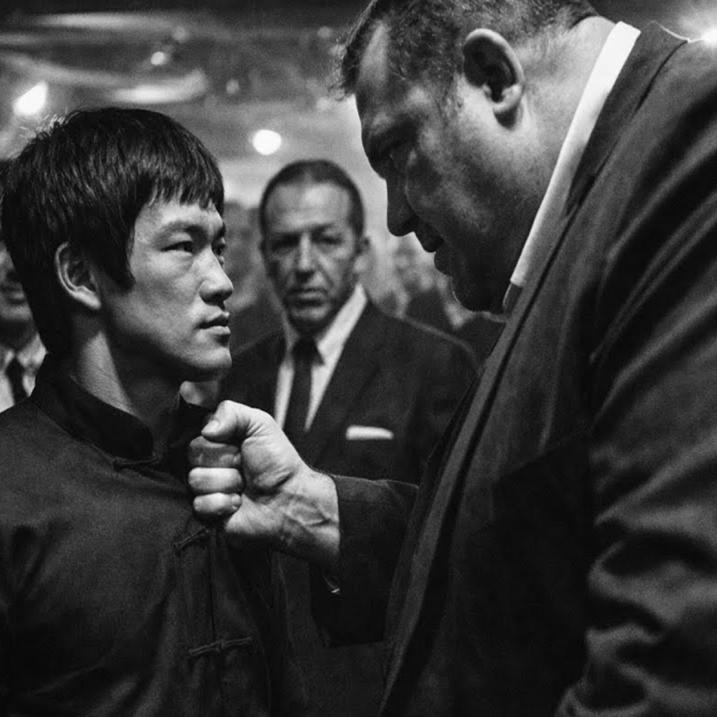 And a 215-pound advantage vanishes. Sinatra saw it all. He saw the attack by a 350-pound ex-boxer. He saw the attack by a 135-pound martial artist. He saw the martial artist dismantle the attack in 11 seconds. He saw physics redefined. Then he hired Bruce on the spot. That’s the story. Simple, straightforward, and powerful. A 350-pound bodyguard attacks Bruce Lee backstage.
