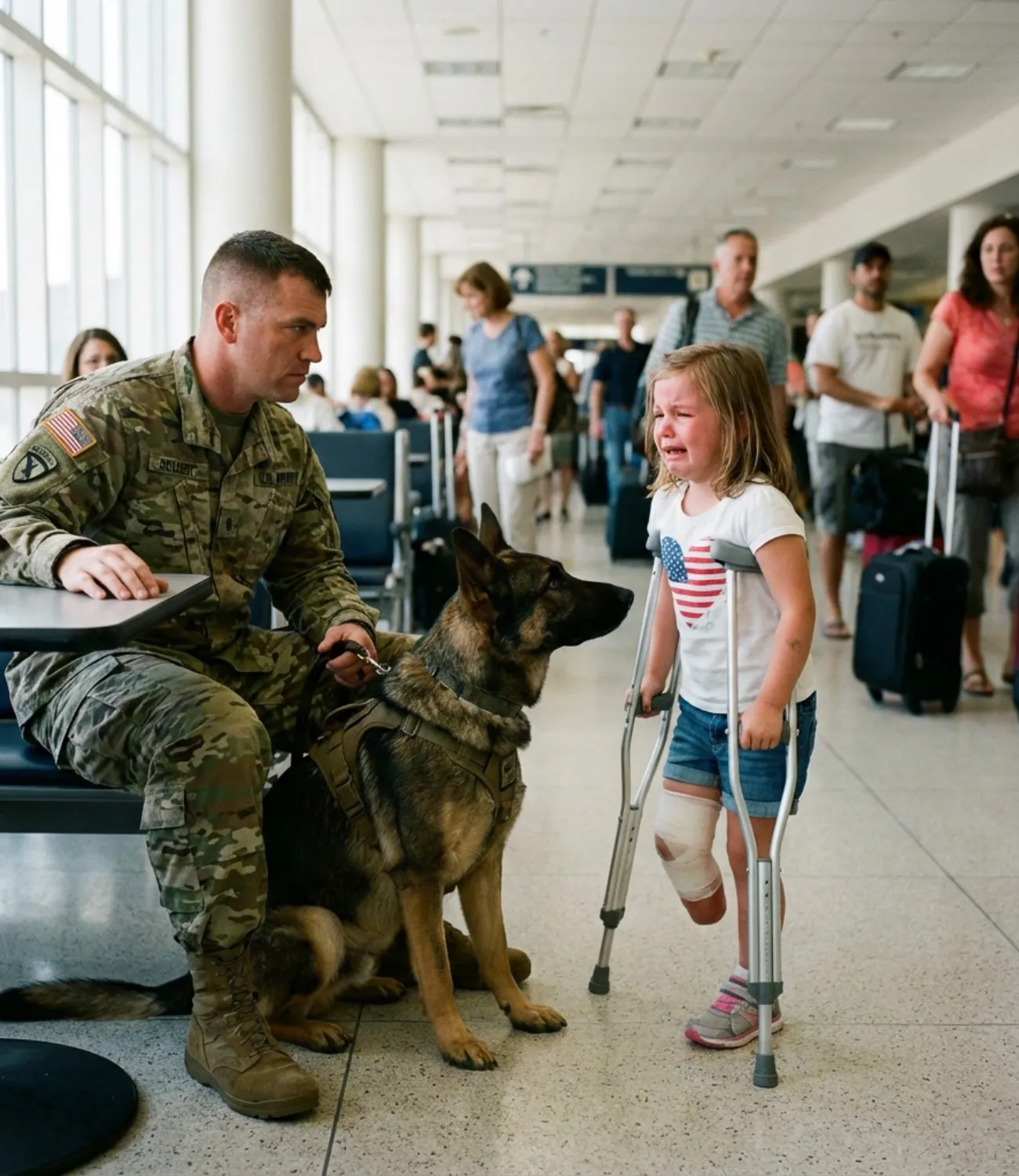 The airport cafe buzzed with rolling suitcases, boarding announcements, and weary travelers seeking coffee before early flights. Ethan Hale sat alone at a corner table, his back straight as usual, a calm presence despite the noise. Years ago, he had carried the Navy SEALs’ trident. Now, retired, he moved with the same controlled calm. At his feet rested Atlas, his retired military working dog, a German Shepherd trained to detect threats long before humans perceived danger.