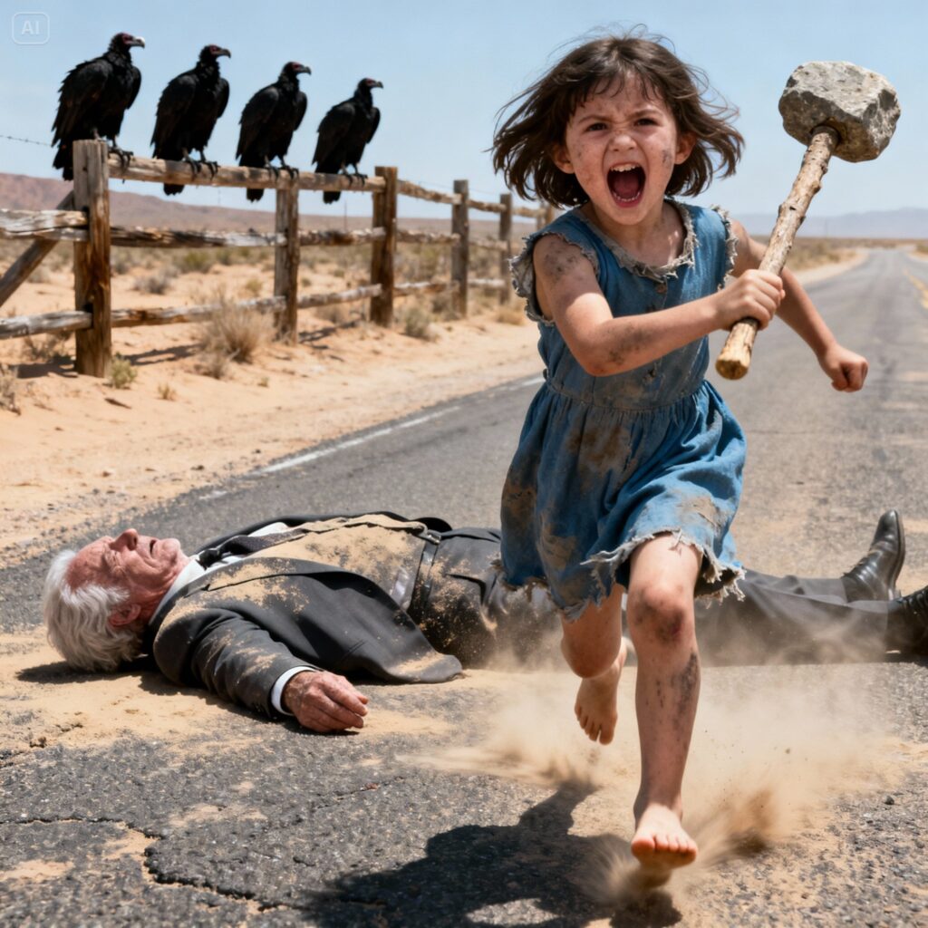 Less than two meters from me, half a dozen enormous, repulsive black vultures hovered clumsily across the asphalt, approaching with the macabre patience of death. But between them and my defenseless body, there was an impossible barrier: a little girl.