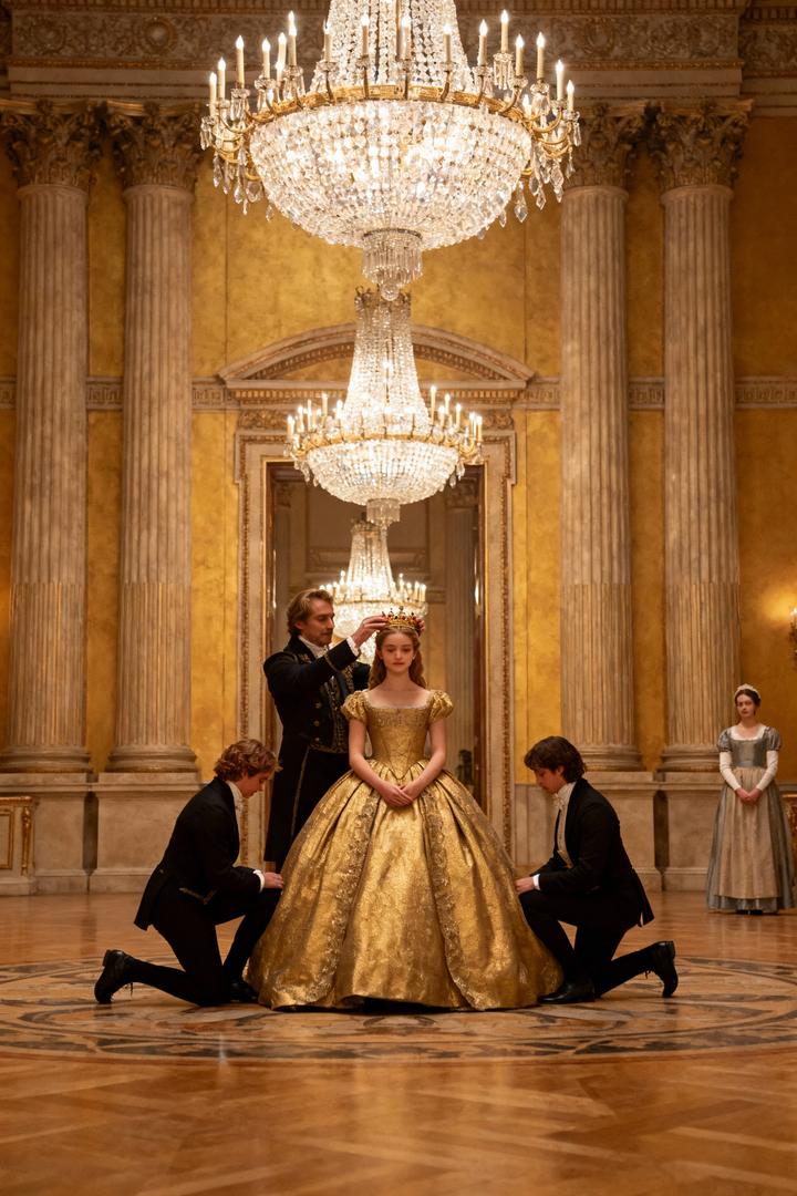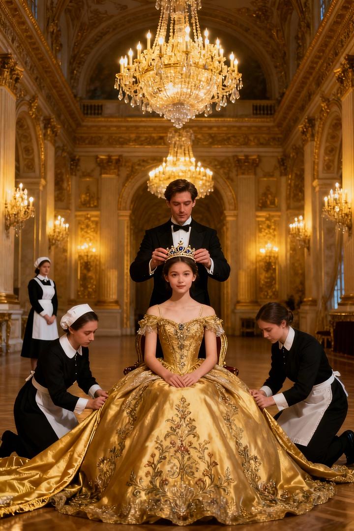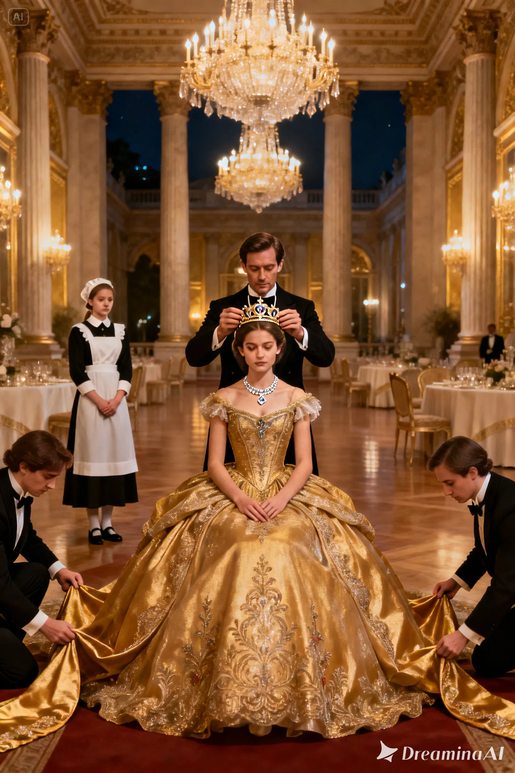 Beneath it was a golden silk dress , designed by a famous Parisian designer, which shimmered in the lights. She let her hair fall freely: long, lustrous, and majestic.