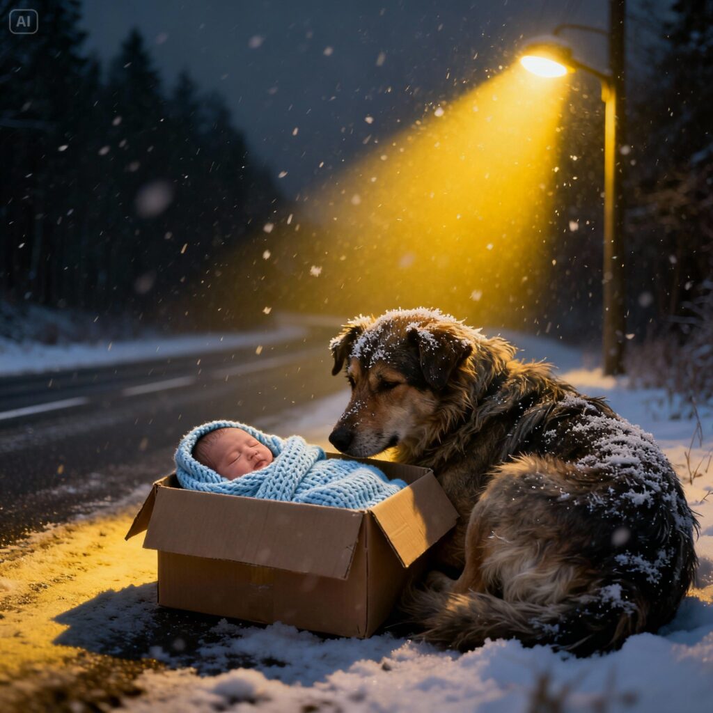 At dawn, some neighbors saw something strange by the side of the road: a motionless dog, covered in snow… and a slight movement inside a box.