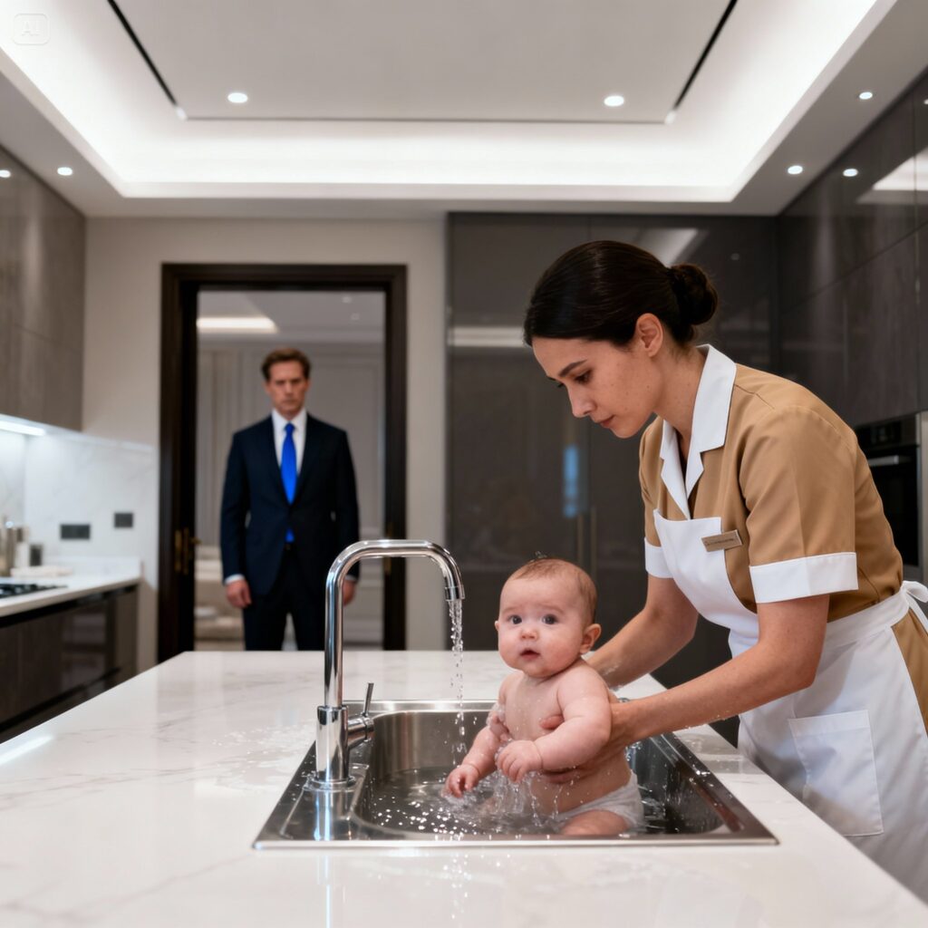 Ricardo Mendonça stood motionless in the doorway. He wore an expensive suit, his face tired, and the shock of the trip etched on his face like a blow. He had returned from a trip cut short by an unexpected cancellation, dreaming of seeing his son, of embracing him, of perhaps feeling that he was still a part of his life. And the first thing he saw was his maid, in uniform, bathing Miguel in the kitchen sink.